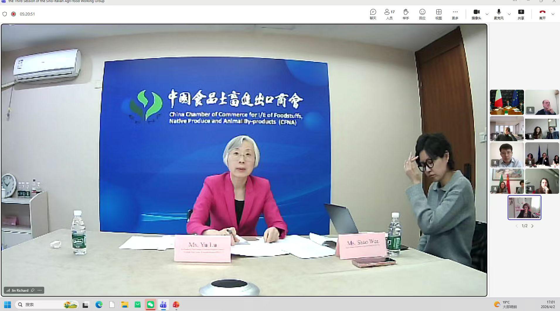 2026年4月2日,中国意大利食品工作组第三次会议在线上召开,中国食品土畜进出口商会和意大利对外贸易委员会是中意双方牵头单位。会议由于露副会长和Brunella Saccone总监共同主持,双方共同回顾了两年来工作组开展的工作,并就农产品贸易形势,贸易便利化、贸易促进等各自关注话题进行了深入的交流和讨论。